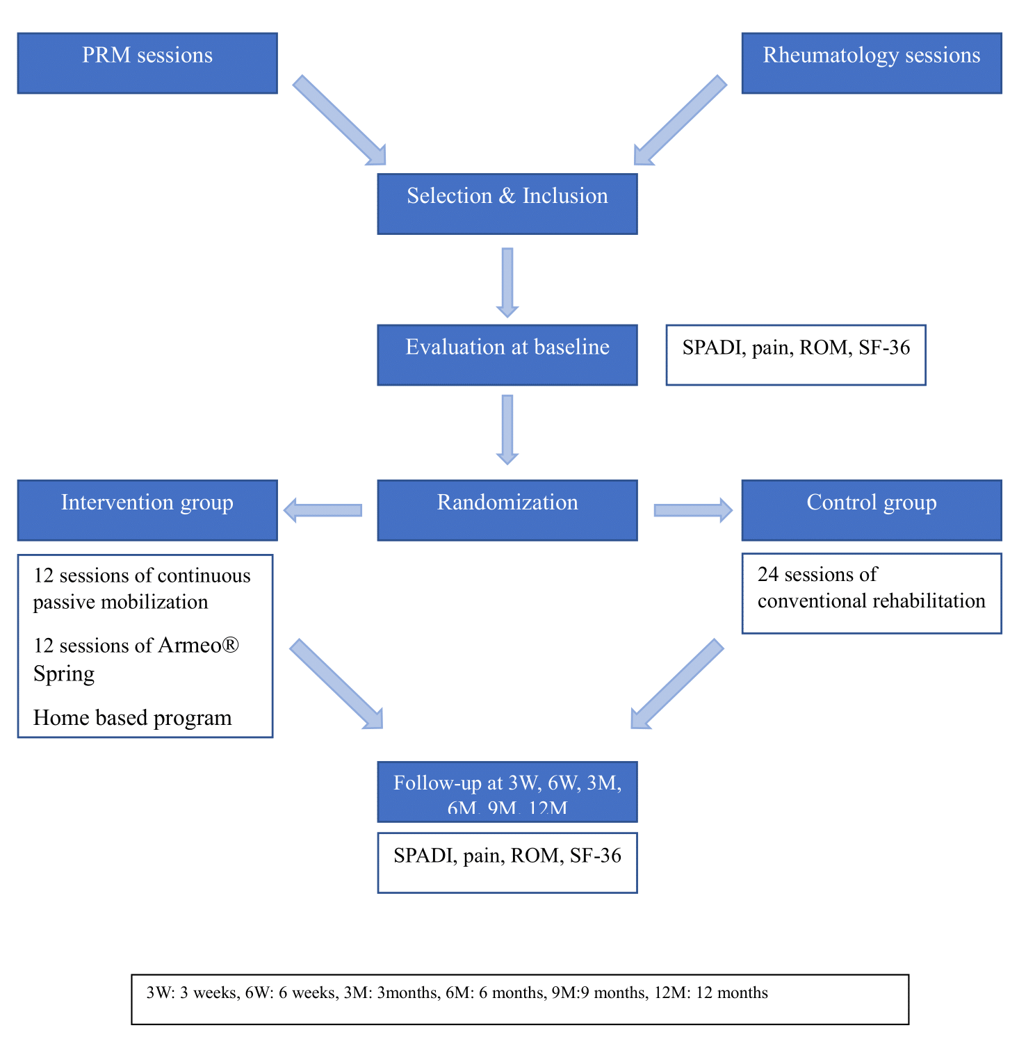 Materials and methods: It’s a single-blind, randomized, controlled trial conducted at the Department of Physical Medicine and Rehabilitation, Rabat University Hospital, Morocco. This prospective analytical study compares robotic training with the Armeo® Spring device combined with passive continuous mobilization to conventional physical therapy in patients with AC. Participants will be evaluated prior to randomization and followed up at 3 weeks, 6 weeks, 3 months, 6 months, and 12 months. The main outcome is the Shoulder Pain and Disability Index (SPADI). Secondary outcomes are: pain, active and passive range of motion, SF-36 index.