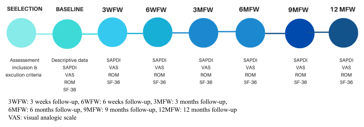 The primary outcome is the Shoulder Pain and Disability Index (SPADI). This is a self-written questionnaire. It consists of two subscales. The first assesses the importance of pain felt on five items. Pain scores range from 0 to 50. The second evaluates the difficulty of activities of daily living based on eight questions. Impairment scores range from 0 to 80. Final scores range from 0 to 130, with higher scores indicating greater pain and disability.