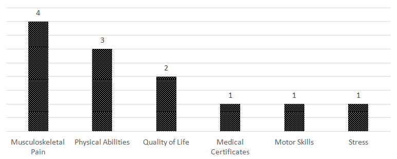 In the (Figure 5) shows that the most studied outcomes are musculoskeletal pain, followed by physical abilities and quality of life. Other outcomes also appear, such as the number of medical certificates, motor skills (reaction time and overall motor coordination), and stress.