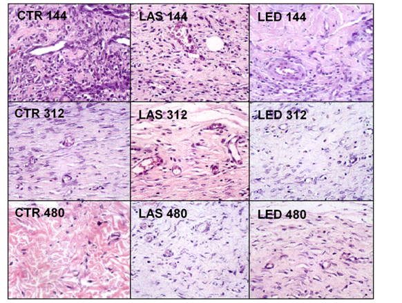 Regarding the intra-group evaluation in the deep dermis, the count of inflammatory cells in the CTR144 group was significantly higher than CTR312 and CTR 480 groups (p<0.001), the same occurring for the LAS144 group versus LAS312 (p<0.05), LAS144 versus LAS480 and LAS312 versus LAS480 (p<0.001 and p<0.05, respectively). The LED144 group was significantly higher than the LED480 group (p<0.001). Regarding the inter-group analysis in the deep dermis, the number of inflammatory cells in the LED144 group was significantly higher than the CTR144 group (p<0.01).