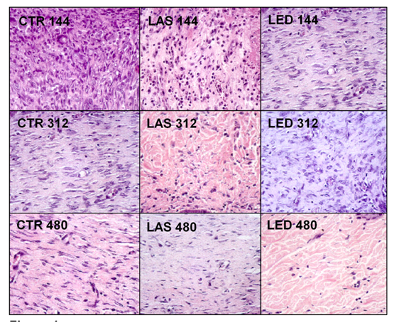 The fibroblast plays a crucial role in wound healing; most studies published in the literature on low-level laser therapy examined their effects on fibroblasts, cell growth, migration and collagen production6. Previous studies demonstrated an increased cellular metabolism, with a higher number of mitochondria in the cytoplasm of fibroblasts in irradiated animals compared to control ones. The increased number of mitochondria was indicative of increased energy demand, which may have caused the increase in the number of fibroblasts and/or increased collagen synthesis.2,13 These data are in accordance with the results presented here, in which CTR and LED groups showed the highest numbers of fibroblasts in 144h, while the LAS group showed the highest number of fibroblasts in 312 h and 480 h when compared to the other two groups. Both treated groups showed a statistically significant higher amount of collagen compared to the control, indicating an increased fibroblast metabolism as suggested by another researches.2,13,14