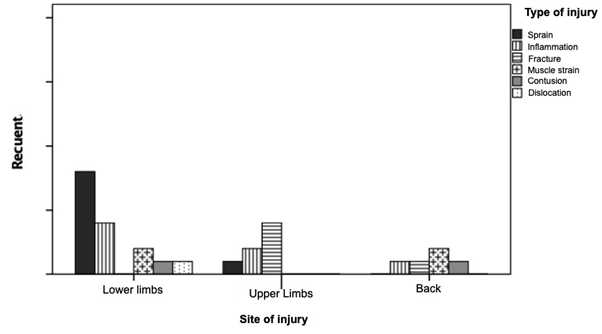 When analyzing the type and place of injury, it could be estimated that 34.8% of injuries occur in the lower limbs, followed by the upper limbs with 15.2% (p = 0.000) and in the back at a lower percentage (Figure 2).