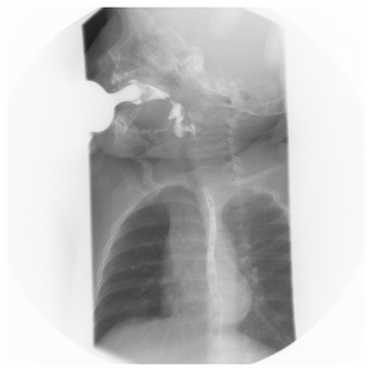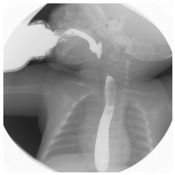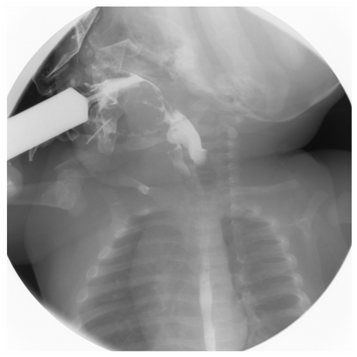 Figure 1 Swallowing study at one month of age shows mild pharyngonasal reflux and laryngeal penetration of the barium solution.