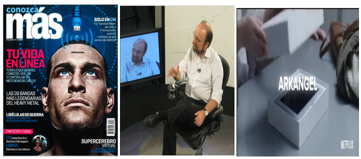 Latin America magazine promoting the Brain net with the slogan “your life online” “all you can know, see and listen without using cables” (left); Miguel Nicolelis, Brazilian scientist, subliminally promotes the Brain net in Wikipedia (center); the promotion of Black Mirror “the Brain net will be your arkangel guardian” (right).