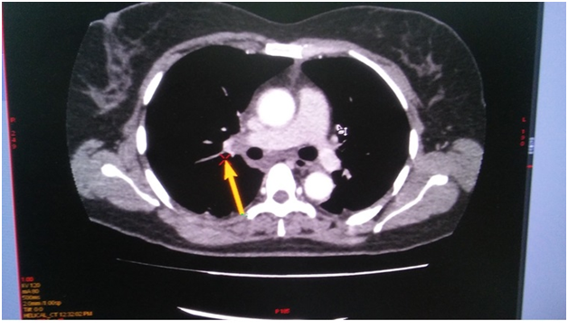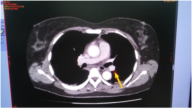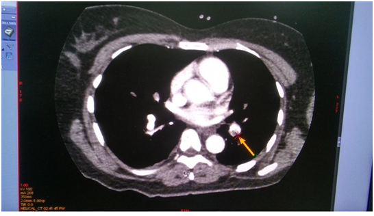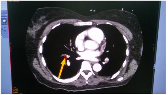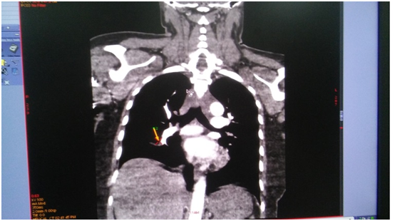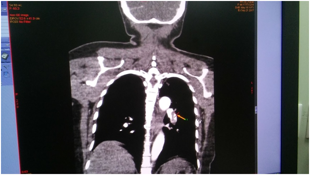 Alteplasa, in dosage of 100 mg, was infused for two hours, follow the instruction. The patient felt relief and decrease of dyspnea. Unfortunately, we got the severe bleeding from the neck drainage. The cell saver machine was connected to drainages and began to reinfuse blood to the pre-installed catheter in the right femoral vein. In sum, we reinfused 1080 ml of blood, transfused symptomatically 940 ml of allogenic blood cells and 1640ml of fresh frozen plasma. In about 5 hours after the beginning of the thrombolysis the bleeding stopped. On the second postoperative day, the patient condition became steady. The control tomography showed no thrombosis in the lung arteries (Figure 5) (Figure 6). Meanwhile, the ultrasound investigation revealed thrombosis in the left shin veins that could be the source of the thromboembolism. Besides, the postoperative wound swelled and the patient felt suffocated. She was taken to the operative theater for revision and performing tracheostomy under general anesthesia. The indication for tracheostomy was a progressive pressure of the soft neck tissues to the trachea, led to strangulation.