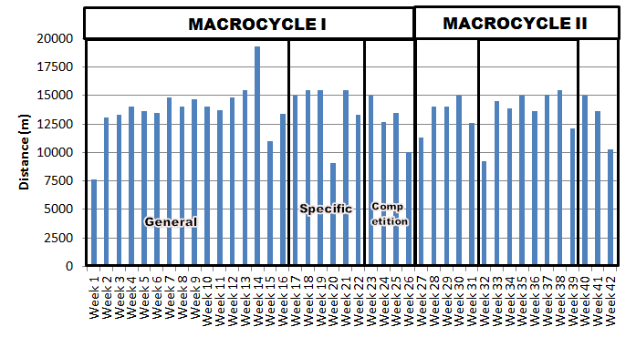 In each Macrocycle, the first training phase predominantly included the development of aerobic endurance, while the second phase of the macrocycles, training focused mainly on the development of anaerobic components and velocity.