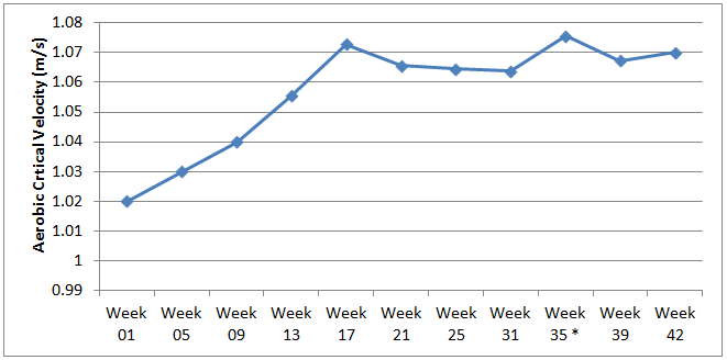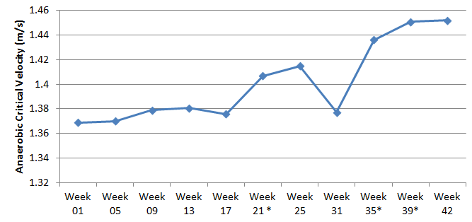 Analyzing the Figure 3, there was a gradual increase in anaerobic critical velocity, and there were significant differences at weeks 21, 35 and 39. Note that the highest values were recorded in the last week of assessments.