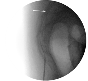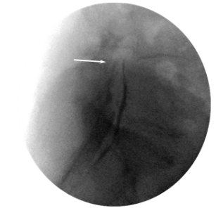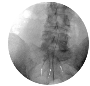 Figure 2 AP view. RCE electrode in lateral canal above the L5 nerve. Arrows – contrast material shown in the epidural space.