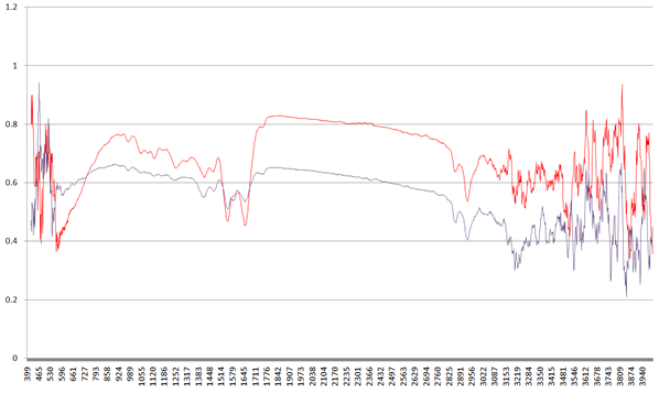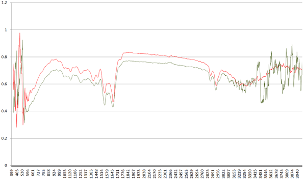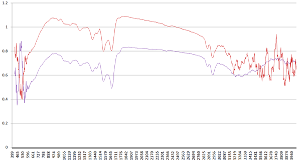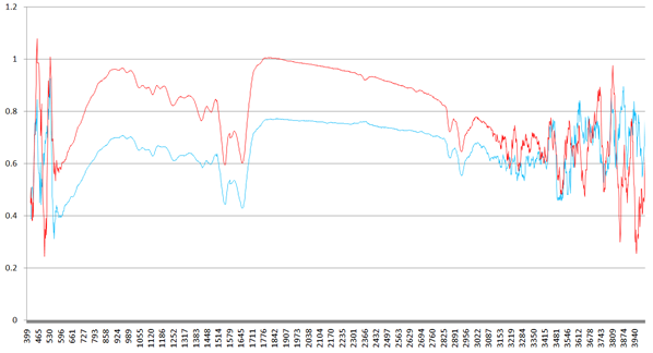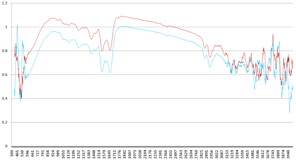 Figure 4 IR spectrum of the skin after exposure of the hand to yellow light through a fiber optic cable for ten minutes.