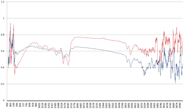 Figure 9 Spectrobiopsy of blood from the surface of the hand irradiated with yellow light for 10 min.