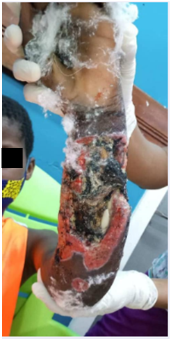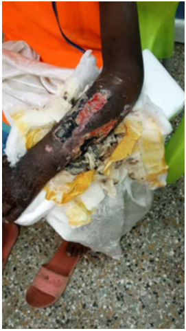 This is a case report of an 8yr-old boy, who lives with both parents in a family house in a suburb of Accra. He is the first of 3 male children. His Father is a housekeeping staff at a hotel while his mother is unemployed. Three weeks prior to presentation, whilst on a visit to his grandfather in the Eastern Region, about 1hour 45 minutes’ drive from Accra, he sustained a closed fracture to the left forearm whilst playing with friends. He was taken to a herbalist who wrapped the arm up with herbs. However, after about 2 weeks, a visiting uncle noticed the arm had deteriorated significantly, hence, the parents were prompted to bring him back to Accra. He was taken to a peripheral facility where he was seen and referred to 37 Military hospital immediately for management.