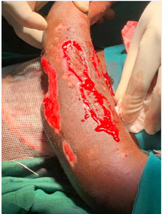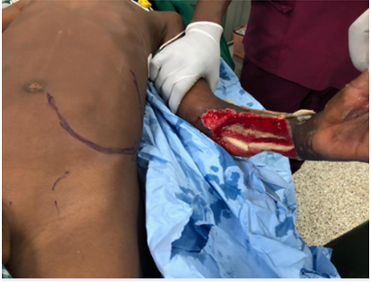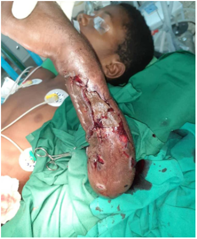 On the day after presentation, he was taken to the operating theatre by the orthopaedics team. There, under general anaesthesia wound debridement was done, Findings were: Necrotic flexor muscles and tendons exposed left radius and ulna. The wound was generally septic.