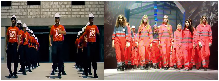 Workers marching like soldiers in a factory in a television spot and robotized women in theatrical representation recreate fascism and digital slavery.