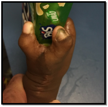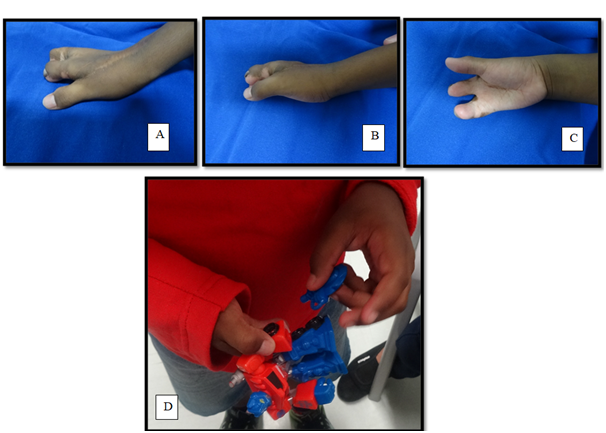 After seven years of follow up, the improvement of function and adaptation of the hand was satisfactory. Hand therapy was present during the follow-up with strategies to prevent scar retraction and stimulate the pinch and grasping and others movements with playful techniques (Figure 4). The goal is alwayshelping the child andtheir family achieve goals of independence and improved self-esteem. In the last evaluation, the patient was able to hold, interact, use and exchange objects between the hands (Figure 5).