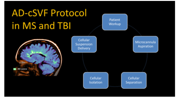 We present the process as a preliminary example of our clinical trial (NCT #02939859) wherein we have been tracking the safety and efficacy of use on autologous stem/stromal cell therapy derived by processing adipose tissue complex to isolate and concentrate its cellular stromal vascular fraction (CSVF). After concentration, these cells are suspended in sterile Normal Saline and delivered via intravascular route. With recognition of certain capabilities of the adipose-derived CSVF, including potentially important immune modulation and inflammatory modulation properties, the trial was established to explore potential advantages of uses of autologous, CSVF in neurodegenerative-related clinical problems. In the face of the disorders not being effectively dealt with using traditional pharmacological products, very expensive medications, and a variety of unacceptable side effects10,11 (Figure 3).