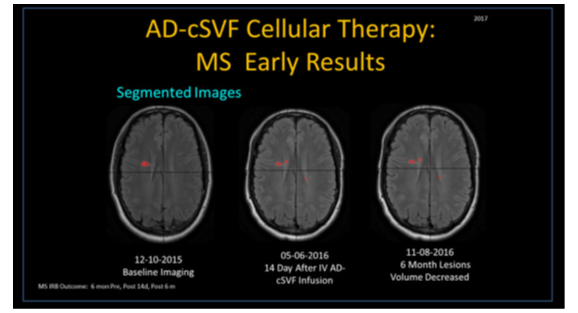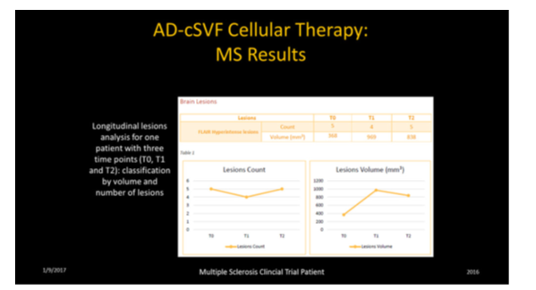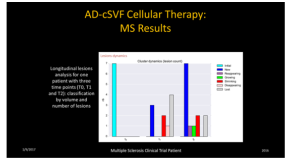Doing interval testing and tracking is an essential to determine the efficacy, and eventually optimize the modalities to work together in management of a large variety of patients. In the clinical trial setting, the efficacy of medications and/or cellular therapy combinations can be optimized and tracked. Early observations and clinical correlations have supported a very good safety profile in all patients, with clinically positive changes for registered patient population within the trial. Much is needed in reporting on long-term tracking at this point in time. Outcomes of early patient groups receiving cell-based protocols will most definitely benefit from an objective analysis. Like the example shown briefly, the early changes are being seen in this population where traditional options are so limited.