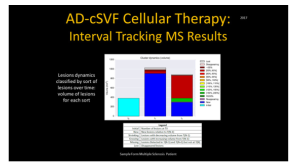 Clinical Trial design and protocols include evaluation of relative points of positive findings on magnetic resonance imaging, and help identifying changes in the neurodegenerative patients. Coupled with standard medical testing, such changes are a means of tracking clinical progress with objective findings of value. As a simplification of our trial, the hypothesis of utilization of CSVF was tested with serial documentation and tracking of changes using the software analysis at 6 month intervals. Interval neurological examination by the patient’s primary specialists, observational diary reporting is coupled with interval subjective Quality of Life (QOL) questionnaires.