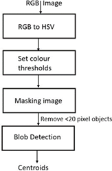 Features or key points are localized regions such as edges and corners within an image which provides interesting information about its content thus differentiating that part from the others. They are repeatedly detected in images captured from various viewpoints of an object, to provide a relation between these images. The features in an image are detected and matched across different images to estimate the position and orientation of the robot in autonomous robots. To do this, commonly employed algorithms such as SURF and SIFT are utilized where the feature points are randomly selected and matched. These feature points are not known prior to the process.17 Presents a comparison of these algorithms based on different scenarios, outlining the results obtained in each case. This paper employs a distinctive approach that involves utilizing known feature points for feature detection. The need for using known feature points is to remove the difficulties related with physically determining the positions of unknown feature points. The use of known feature points facilitates a straightforward physical analysis of their relative positions, making them easily comparable. The features to be detected are given in different colors. The algorithm is expected to identify and segment the images based on their respective colors and determine the corresponding centroids. The steps involved in the algorithm are shown in Figure 1.