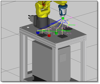 Defining the “pick and place” task: While making the LR Mate200iD’s DT the task chosen for both robots was defined as a “pick and place” task” repositioning 3 identical cubes from ROBOGUIDE’s library (length of 30mm), initially positioned on the workbench as shown below on the Figure 2. Each block has your base (drop positions during the “pick and place” task). To use as a base for each cube the “plastic pallet” model was imported from ROBOGUIDE’s library and scaled down to 1:10 and positioned in a way that the robot could reach all the bases’ centers to place each block forming the yellow trajectory profile shown in the Figure 2 below.