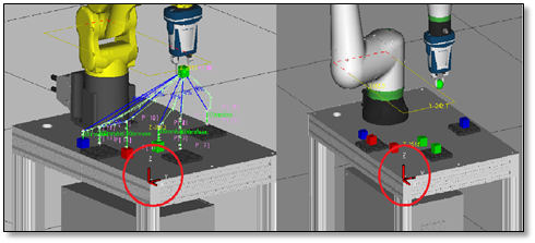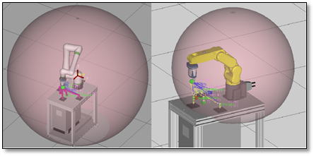 The ROBOGUIDE software has the “work envelope” tool that allows to see the space that the selected robot can reach with all the end-effectors registered (0-10). Not necessarily if the point is inside the envelope the robot will reach it due to other issues such as singularity and joint angle limits. Such feature was used while programming the robots to define each point of the program which the robot can reach and perform the “pick and place” task