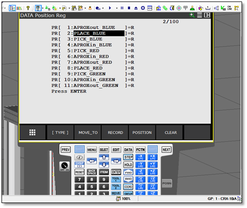 Programming of the robot: The first thing done to begin the robot’s program was defining the user frame 1 identical to both DTs, as shown on the Figure 3 below, to have all the program’s position registers referenced to it and not the robot’s base allowing to add precision to the movement of the program’s cloud of points so that the points as a backup for future use. The program was assembled using position registers to guide the robot and have an accurate record of its movements. Thus, each register follows the following naming rule: capture approach points begin with “APROXin”, capture points begin with “PICK”, palletization approach points begin with “APROXout”, palletization points begin with “PLACE”; and all points end with the color of the block they are manipulating, “GREEN” for the green block, “BLUE” for the blue block and “RED” for the red block. The position registers are shown in Figure 4, each one used to form the robot’s path. This way, after setting all the position registers in the first DT with the LR Mate200iD model, by copying the coordinates of each position register from the user frame 1 it was possible to recreate the same position registers in the CRX-10iA DT allowing the COBOT to perform the exact same trajectory as the industrial robot, needed to validate exclusively the differences from each robot’s work capabilities and not the difference of paths