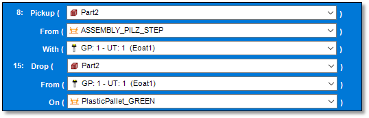 Simulation of the robot: Just running the program created won’t track the data needed to validate the performance difference between the robots so a simulation is required to not only validate the performance data but also simulate the robot’s “pick and place” task because the movement of the parts (blocks) depends on the simulation commands of pickup and drop as shown on the Figure 6 below the commands used while teaching the simulation to set the movements of the part 2 (green block) when the simulation is running allowing the robot to capture it, hold it and drop it on its base. All the other two blocks (parts 3 and 4) have the same commands.