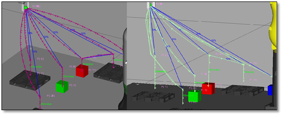 During each simulation in ROBOGUIDE After each movement of the robot its path is registered as a trajectory profile showing the exact path taken by the TCP between each recorded position of the program. Between each point, the path is divided in shorter linear discreet movements that add up to make the robot’s movement profile. The CRX-10iA default trajectory profile has considerably more and shorter discreet movements during aerial motions than the LR Mate200iD trajectory profile as shown in the Figure 7 below: with the purple and green lines respectively the COBOT’s profile and the industrial robot’s profile, the blue lines indicate the speed (50%) of the joint movements i.e. unpredictable moves that follow the quickest path as possible.