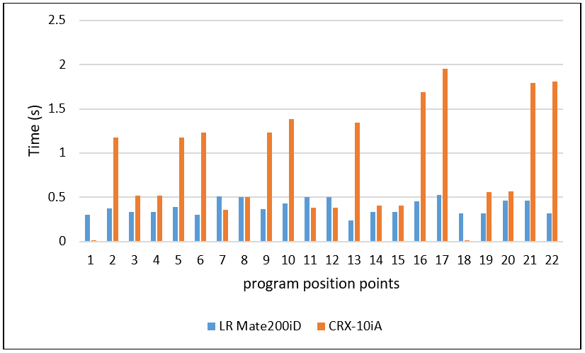 ROBOGUIDE has a tool called “MotionPRO” which can validate different performance data from the simulation profile and was used to study the time taken for the motion between points of both robots and the results of the time consumed through all the 22 points in the program are shown in the Graph 1 below.