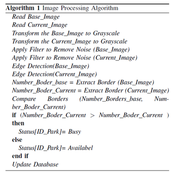 Figure 7 show the comparison of the original image with the image hat pass by the Canny. For implemented all this process we used the Open CV library18 that provides several methods to be used in the image processing. The proposal algorithm firstly reads the images (lines 2-3 in Algorithm 1). The algorithm converts the read images to grayscale (lines 4-5) through the cut Color function. After that, it applies filters to remove the imperfections and noises (lines 6-7) by Blur function. So, the algorithm detects the number of borders in the images (lines 8-9) using Canny and comparing them (10-12) through the find Contours that retrieve contours from the image. The contours are used to detect the objects in the images. If the number of the Current Image is greater than the Base Image, the system set the status of the parking lot place as busy. Otherwise, the system set the status of the parking lot place as available (lines 13-16). This information is updated into the database (line 17) and is used by the mobile application. The results of this algorithm we can see in the Figure 8 that shows the images gotten from the implementation of the proposed algorithm using the Open CV functions.