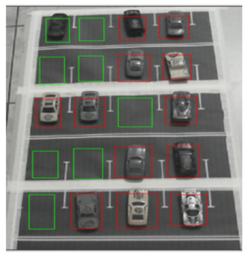Once defined the parking spaces, the system starts the monitoring of the parking spaces through the new images coming from the sensor nodes. The data center will use the Base Image and the image obtained real-time from the sensor to detect the available parking lot. The service draws a green rectangle in all available parking spaces. Whether the system detects that a parking space has been occupied, it updates the status information of the parking space into the database and draws a red rectangle in the parking place busy as we can see in the Figure 11. The information stored into the database about the parking space is accessed by the mobile application that will show the information to the users using a friendly interface. The Figure 12 illustrates the interface showed to the users. The mobile application has a grid interface where will showed the current status of each parking lot place defined in the system.