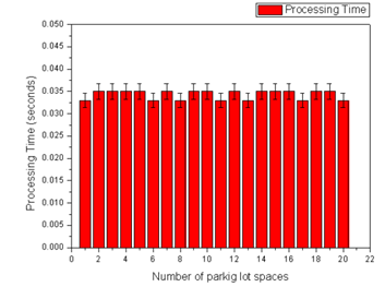 In order to evaluate the SPANS service, we used the developed infrastructure to make tests were made using a scale model of the parking area where were defined 20 parking lot places. Each parking lot place was inserted into the database with the available initial status. For this, we created a model that represents the parking place of Federal Institution of So Paulo, Catanduva, Brazil. The Figure 13 shows the result of the image processing take into account the scale model used in the tests. This test will evaluated the time that the service will take to processes the images based on the number of lots that the parking has. Therefore, we want to verify the time spent to find the parking lot places available. The Figure 14 shows the processing time spent to find the available places. As can be seen in the Figure 14, the average time spit to find an available place in the parking lot area is 0.036 seconds. This means that the time spent to find the available places was proportional for all parking area. The system could find the parking lot places available with 93% of accuracy in the tested environment. Thus, SPANS can manage parking places without impair other services that can be perform in the intelligent transport system.