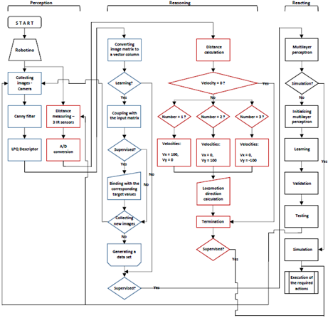 As demonstrated in paper,17 the proposed system structure is divided into three segments: Perception, Reasoning, and Reacting. In the "Perception" section, data is collected and pre-processed from three infrared sensors and a camera. The system processes the data received from the sensors, compares it with the required reference input values in the "Reasoning" section, and makes a judgment for the robot's output movements. Finally, the "Reacting" section provides the final calculations to take the necessary actions, such as robot movement or obstacle avoidance. Figure 1 depicts the system structure.