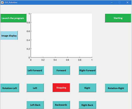 To control the movement of the robot and the functions of the proposed system from the MatLab environment, a separate GUI was created. The GUI allows the control algorithm to start, as well as individual control of the robot's movements in different directions. It also includes all the previously mentioned functions of gathering information from sensors, detecting obstacles, and undertaking tasks of moving and avoiding obstacles. Figure 4 shows the GUI.