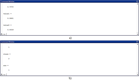 In the MatLab command line it is possible to see which of the sensors detected an obstacle. If one of the IR sensors detects an obstacle, voltage values will appear in the command line (value0, value1, value8), as shown in Figure 6a. If the camera detects an obstacle, the class from which the neural network classified a particular obstacle will be displayed (class = 1, class = 2, class = 3). (Figure 6b)