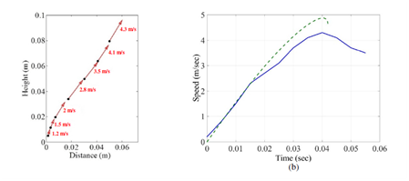 Figure 3 Prototype results for (a) Trajectory with velocities indicated and (b) Speed versus time comparison of experimental results (blue line) and simulation data (dashed green line).12