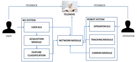 In Figure 1 is reported the general architecture structure. The system is based on the UnipaBCI framework, a modular architecture entirely developed by the authors and presented in a previous paper,12 easily scalable and flexible to allow the development of new features or the removal of the older ones, maintaining the general structure unchanged. The framework has been developed using Microsoft Visual Studio 2012 to provide a complete IDE for the code writing. The operating system used to implement UnipaBCI is Windows 10 since it provides more support to the API of the g.usbAmp hardware device used to test the framework. C++ was selected as language, because it introduces a low performance overhead at run-time. GUI and other visual components are implemented in OpenGL. It is composed by a GUI which provides feedback to the patient (from now on defined user) who wears a bio-signal amplifier. The amplifier acquires EEG signal in real time from user’s brain converting in messages. A cloud based network system, interlaces user with robot controller, where the stakeholder (from now on defined operator) visualizes the messages. The operator controls the Telenoid robot in tele-operation mode, in such operating mode; the telenoid robot repeats each movement of the operator and speaks reproducing his voice.