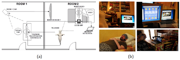 The operator console is used by the operator to have a feedback from the user. The operator console, performs the speech synthesis allows the operator to modify the settings of the speech synthesis, such as tonality, speed of reading and the language used. A button has also been inserted inside the window to delete the chat history. This module implements a web server for real time communication between user and operator. Each command, selected via the User Interface it is sent over a Java Servlet connected to a web socket. Every time a message is received on the Servlet, it verifies if the client is connected and forwards the message. The message is vocally reproduced through the Google Speech API. The described architecture has been tested in a real-world scenario with an ALS male patient of 31 years in Palermo with no prior knowledge of Brain Computer Interface and robotics. In Figure 3 is reported the experimental setting. User lies in this room (Room2) with a BCI monitor in front of him and wears a G.USB Amplifier, connected to a BCI server. User can see the Stakeholder room by a cam connected to a secondary monitor. User controls a BCI system to send messages to the Telenoid Tele operation Controller, in Room 1, where Operator sits. The Telenoid Tele operation Controller is equipped with tracking software and audio-video connection with the Telenoid robot, sets in room 2. Operator answer to the user speaking on his tele operation console and Telenoid reacts repeating his head movement and speaking with his voice, giving user the feelings to be with the operator.