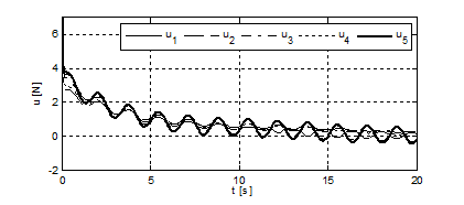 The control design aims to bring the trolley from an initial condition to a desired position while the payload swing angle is suppressed and vanishes completely at the load destination. This objective indicates that the state variables should reach their desired valuesafter a short time. The forceis derived initially by using an energy-based approach. The friction force is then added to obtain the actuating forces from Eq (2):