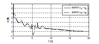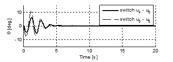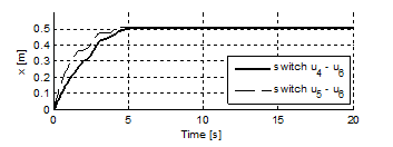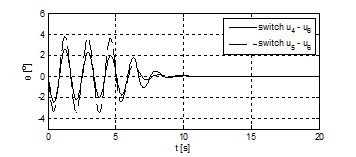 The aforementioned nonlinear controllers in Eqs. (22) to (26) guarantee the stability of the desired position; thus, the state variable and are small around the end position. Therefore, the stability of the closed-loop system is still guaranteed by switching from the nonlinear controllers to the LQR controller in Eq. (34). In the following simulation, the LQR controller is switched on when the trolley reaches 80% of its path. The simulation results by the combination of nonlinear (25) [] and linear controllers (34) [], as well as (26) [] and (34) [], are shown in Figure 5-7. Figure 5 shows that the time history of the trolley displacement is not changed significantly after switching to linear control. The advantage of switching to the linear controller is clearly shown by comparing Figure 6 & 3. The swing angle after switching time converges to zero in a short period.