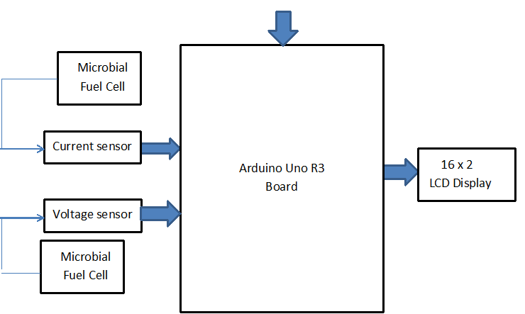 The block diagram showing the process flow is shown in Figure 4 while the components’ connections to the Arduino were done using Dip Trace v3.3.4 and is shown by schematics in Figure 5. The connection of the MFC, the multimeter and the Arduino-based voltage and current monitoring device is shown in Figure 6. The code was also written to take readings and print after every 1 minute. Daily voltage was then averaged and reported. Based on previous tests an adjustment factor was added for better fitting at low voltages, the printing command of the code was modified to work with the public interface PLX-DAQ in Microsoft Excel. The final code is shown in appendix 1.