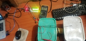 The prototype consists of an Arduino (mega) board, Liquid Crystal Display (LCD), a voltage sensor and a current sensor interfaced and connected on a breadboard. The evaluation of Arduino UNO for monitoring cell potential was done using a double chamber MFC was inoculated with cow dung. Each chamber volume was 1500cm3 and contained 5 of graphite rods totaling an electrode area of 0.00666m2. The external resistance used in the test was a 1000Ω resistor. The chambers were separated with a NaCl salt bridge. The anode chamber was inoculated with cow dung and tomato waste while the cathodic chamber contained water. The operation’s initial pH was 7.23 for the analyte and catholyte. The cell voltage was simultaneously monitored with both an Arduino UNO and a multimeter (DT9205A); the readings were set every 1 min. To improve the accuracy of the Arduino UNO, we improved the resolution of the Arduino board and decreased the noise. The analog to digital converter (ADC) resolution on the Arduino UNO is 10 bits, meaning that when using the default voltage reference of 5V, every digital unit represents 4.88 mV, being a low resolution. To overcome this issue voltage reference of 0.83 V was set to improve the ADC resolution. The AA batteries were used as constant DC power source and was implemented a voltage divider with a 33 kΩ resistor and the internal resistance of 32 kΩ of the Arduino board. According to the voltage divider equation Vf=Vi*32/(32+33), the final voltage should be around 0.73 mV, but after reading it with a multimeter, the true voltage (0.83 mV) was added to the code. The current was measured using the two methods across an LED.
