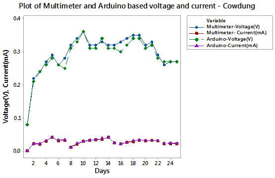 The MFC cell potential and current were monitored for 24 days using Arduino based sensors and a multimeter. The average daily voltage and current are reported. Figure 7 shows the voltage and current on tomato waste measurement of both instruments and that of the Arduino UNO follows closely the multimeter line, showing only some observable noise in the readings. The daily voltage recorded was in the range of 0.05 – 0.34V while the current ranged from 0.002 – 0.05mA. In Figure 8, the voltage and current monitored using the two methods was plot against time. There was no observable difference between the two methods. The daily average voltage and current were in the range of 0.08 – 0.35V and 0.001 – 0.041mA respectively.