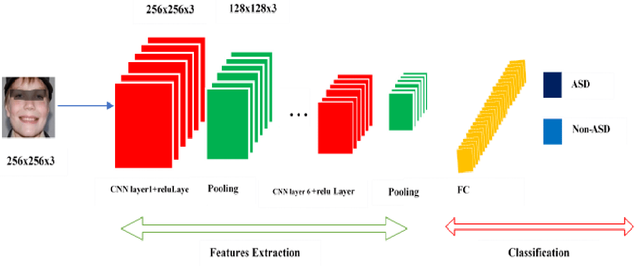 The study suggests that the random SVM cluster method has potential for assisting in the auxiliary diagnosis of ASD, based on resting-state functional magnetic resonance imaging (fMRI) data.12 The researcher using brain imaging data from the Autism Brain Imaging Data Exchange (ABIDE) dataset to identify ASD. Here used Multilayer perceptron with backpropagations algorithm.13 The paper discusses mobile autism risk assessment tools. Designed for mobile devices, the program identifies kids at risk of autism spectrum condition early. They use binary firefly algorithm, they got 91-92% accuracy.14 The researchers used crowdsourcing to get information. They gathered a lot of clinical tests and behavioral observations from people with autism and ADHD, as well as from people who were growing normally. They use SVM algorithm with 60 to 90% accuracy.15 These studies used SVM random algorithm with an accuracy of 89%.16−18 The research provides a machine-learning approach to predict autism symptoms in any age. The research presents a more efficient and accurate machine learning approach by mixing Random Forest-CART and Random Forest-ID3 algorithms to predict autism. A smartphone app based on this model was created. The suggested model was tested using the AQ-10 dataset and 250 real datasets from autistic and non-autistic people.19 The paper investigates graph representation learning methods and deep neural networks to detect ASD patients using brain functional connectivity characteristics. AWE, Node2vec, Struct2vec, multi-node2vec, and Graph2Img represent the ABIDE I and II databases, with Graph2Img being the best. The study achieves 80% accuracy for leave-one-site-out cross-validation using PCA for feature vector extraction and latent deep neural network for classification.20 This study presents a practical method for screening Autism Spectrum Disorder (ASD) using face images. We utilize VGG16 transfer learning-based deep learning techniques on a distinct dataset of clinically diagnosed children with ASD that we have gathered.21 In this work introduced a deep learning model, Mobile Net, which uses deep learning to classify children into healthy children or potential autistic children according to their facial images. The dataset used in this research is from Kaggle.22 Using a Deep Convolutional Neural Network (CNN) to classify facial emotions in people with and without Autism Spectrum Disorder (ASD) using electroencephalography (EEG) signals. The study discovered that CNN successfully identified facial emotions for both ASD and non-ASD groups, implying that facial emotion information is present in the brain signal of people with ASD.23 The paper talks about how machine learning techniques could be used to find autism spectrum disorder (ASD) automatically using brain imaging data. It talks about how machine learning methods can be used to find ASD early on and the problems when combining machine learning with brain imaging data from different places.24 This work employed transfer learning with MobileNetV2 and MobileNetV3-Large models trained on ImageNet to recognize and identify facial expressions in autistic children.25 The researchers created an autism classifier using deep learning techniques. They trained a computer vision model using video data from a mobile game application.26 The paper discusses the advancement of artificial intelligence (AI) models in diagnosing autism spectrum disorder (ASD) through analyzing facial expressions and clues. The paper investigates integrating convolutional neural network (CNN) models with XGBoost and RF algorithms in hybrid systems.27 The paper discusses creating a real-time system that can identify emotions in autistic children by utilizing deep learning and Internet of Things (IoT) technologies. The system's objective is to identify emotions in autistic children and to aid in the management of pain or rage. The document also emphasizes the significance of assistive technology in enhancing the quality of life for those with autism. The text underscores the importance of choosing suitable assistive technology that aligns with individual requirements and features. In addition, the document discusses using facial expression recognition for the early detection of autism.28 The suggested paper plans to use deep learning models (CNN) to classify images of facial expressions for people with autism spectrum disorders and Non-ASD. We used and prepared data to be fed into CNN models. The image was split horizontally and vertically to use as a feature extractor and a binary classifier to correctly find children with autism. In this paper, we present a convolutional neural network classifier for the classification of ASD and non-ASD. The rest of the paper is organized as: section 3 presents the proposed system modeling and the main database, section 4 presents experiment, section 5, 6 is the discussion and conclusion.
