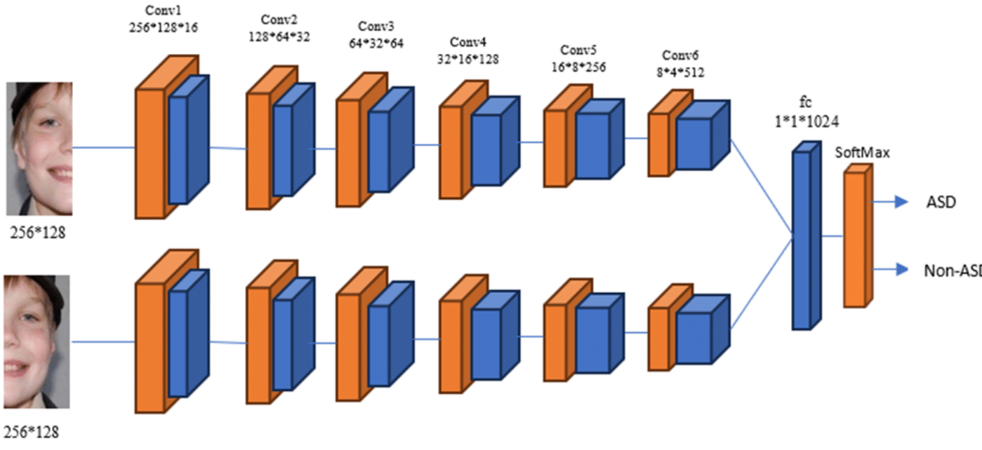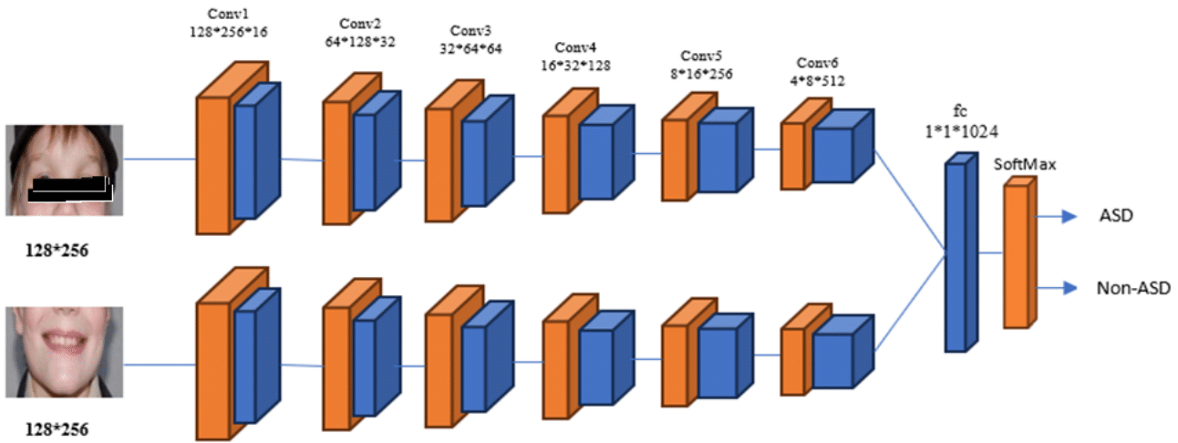Initially, we put the original images in two folders (half for autistic and another half for non-autistic) as classification labels. In this approach, we used two folders to apply two parallel convolutional neural networks to classify and predict autistic and non-autistic, as shown in Figure 4.