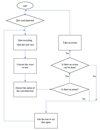 After this training, the model will have a stronger sense, thanks to NLP and the recurrent neural network RNN. The advantage of utilizing RNN, in this case, is that it considers the interdependence of all terms in the phrase. Because the sequence of words in the phrases might affect the meaning or aim, it's critical to extract the sentence's intent. The Wit.ai proved adequate for intent recognition. It's straightforward to use, and it's the only free option that was discovered before the start of the project's implementation. To use any Application Programming Interface (API), the script either needs to send a request or receive a response from the API. However, both operations need some preparation to work correctly. After a successful request, the API will send a response back. This response usually comes in JSON format, so it needs to be filtered because it contains a lot of unnecessary information that needs to be filtered and eliminated. After the filtration, the script has the information that it will use to make a decision. Text to speech is a way of transforming a response to convey what was done if an action was taken or to show that it did not understand. Text to speech (TTS) has a variety of options. There are several non-AI alternatives available, but the Google "gtts" AI-based solution was the best choice because it does not require an account or a large library to be loaded on the machine.15,16 Figure 5 & 6 shows the steps for converting text to speech using AI. Table 1 present the comparison between STT solutions.
