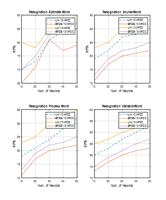 The recording was divided into part training (70%), validation (15%), and test (15%). In addition, a set of algorithms for the training process will be applied, for example, Levenberg-Marquardt (LM), Bayesian Regularization, BFGS Quasi-Newton Resilient Backpropagation and Scaled Conjugate Gradient. Table 2 present recognition percentage (RP%) Vs number of neurons for 10 MFCC coefficients with different training algorithms. Also, TABLE 3 presents recognition percentage (RP%) Vs the number of neurons for 13 MFCC coefficients with different training algorithm networks. As seen from Figure 9 the highest recognition percentage of all the academic words was based LM training algorithm with 13 coefficients of MFCC. Figure 10 display the high-performance correlation between the target and actual database LM with 50 neurons in the hidden layer of neural networks. Figure 11 explains the training data error decrease as the NN learns.19,20