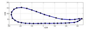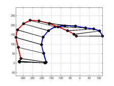 Ordinary camera is used to take videos of the tester's stepping up process, and the videos are captured frame by frame. Then, under the environment of MATLAB, the coordinates of the marked points are obtained by grayscale and filtering of the original photos. The curve drawn by the coordinate points got before in MATLAB is the stepping gait trajectory of normal people, which is shown in Figure 2. The blue curve represents the trajectory curve of the first metatarsal bone, and the red curve represents the trajectory curve of the heel center, and the black line between the marked points represents the posture of the tester's feet at a certain moment.
