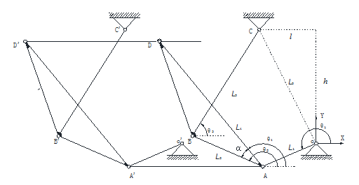 Kinematics simulation analysis of stepping gait mechanism based on ADAMS: Similar to the walking gait mechanism, the stepping gait mechanism is also bilateral symmetry, so the kinematics analysis of the right stepping gait mechanism is carried out. The kinematic diagram of the right stepping gait mechanism is shown in Fig. 7. The coordinate system is established with O point as the origin. Then the vector , , , , , , , , , are defined, and the length of vector is respectively. The angles of the vectors are, which are counted from the fixed axis X in the counterclockwise direction. The angle between AD and AB is, and the projection lengths of OC on X and Y axes are l and h respectively,