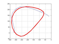 The space trajectory of the two pointsandon pedals during walking rehabilitation on stepping gait mechanism has been displayed in Figure 10. The two points are corresponding to the position of the heel center and the first metatarsal of the rehabilitation trainees. Through the previous analysis, it is known that the movement curve of the heel center is similar to that of first the metatarsal in the stepping up process. Therefore, the curve of the first metatarsal is analyzed here to achieve very good correction effect. In Figure 11, the curve represented by the blue dotted line is the stepping up trajectory curve of the first metatarsal of the normal people, while the red curve represents the gait trajectory of the same position in the stepping gait mechanism of the lower limbs rehabilitation robot. The red curve is a closed curve, because there will be a reset process during the stepping gait rehabilitation training. Through the comparison of the two curves, it is found that there are bits of differences between the trajectory of stepping up gait mechanism and that of normal people. But the changing trends of the two trajectory are basically the same, so that the rehabilitation exercise can be achieved.