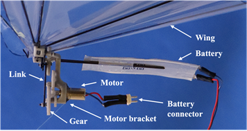 Flapping flight is a flying mode found in birds and insects, capable of various flight maneuvers such as gliding and hovering, as well as high turning and acceleration performance. The flapping has drawn attention to flapping as a flight mode, and research to incorporate this mechanism in the investigation of micro aerial vehicle (MAV) development has been active.1−3 Some flapping-wing MAVs (FMAVs) are modeled on bees,4 which are smaller in size, but their payload makes it difficult for them to carry a battery, and they must rely on an external power supply. In addition, a typical FMAV must have a tail wing for attitude stabilization and control left-right flapping motion for attitude control.5 However, these increase the degrees of freedom and the number of actuators, leading to increased complexity of the mechanism and an increase in the mass of the machine body. Therefore, we have developed FMAVs modeled after a swallowtail butterfly.6,7 The butterfly has a flapping frequency of about 10 Hz, which is lower than that of other insects, and its front and rear wings flap in the same phase, so its wings' freedom is also considered low. It is also larger than other insects, with a wingspan of about 100 mm and a mass of about 0.5 g. It is thought that existing motors and batteries can be mounted on it.